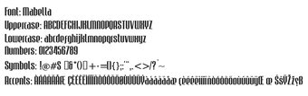 Met zijn hoge, smalle lettervormen en scherpe randen straalt Mabella zelfvertrouwen uit, terwijl variaties zoals ruwe of omtrekversies een ambachtelijke uitstraling bieden. Dit maakt het ideaal voor merchandise en creatieve editorial layouts. De balans tussen leesbaarheid en unieke flair maakt Mabella een uitstekende keuze voor opvallende koppen en dynamisch displaywerk, waardoor het een waardevolle aanvulling is op de toolkit van elke ontwerper.